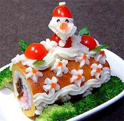 Сливочное масло или взбитые сливки – выдавлено из кондитерского шприца (для помпона, бровей, бороды, усов и волос Деда Мороза);